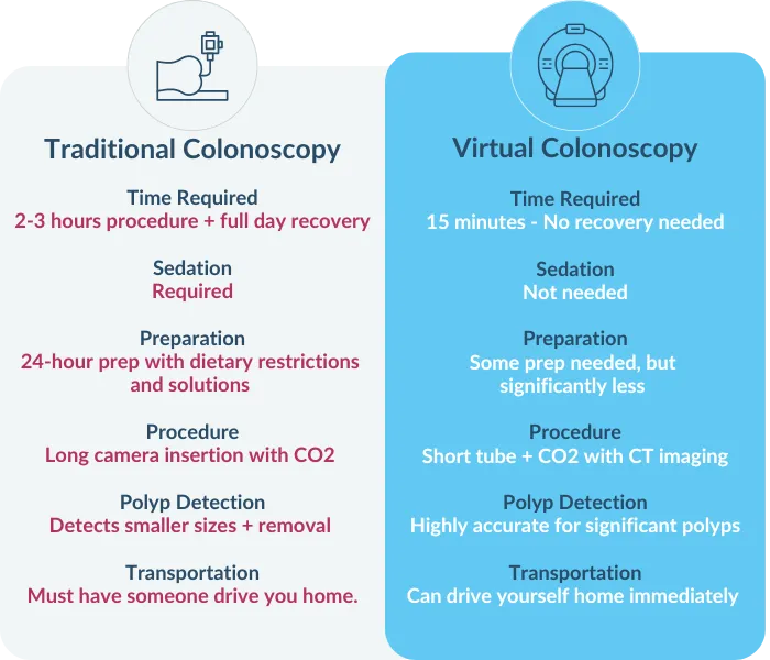 Zero Risk of Perforation – Unlike traditional colonoscopies, Virtual Colonoscopy has no risk of complications.